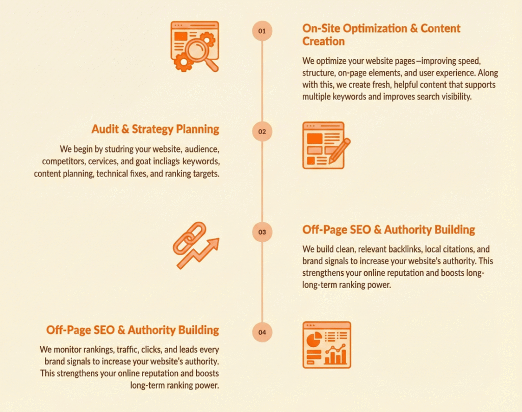 We follow a clean and structured SEO process that keeps your growth consistent month after month.